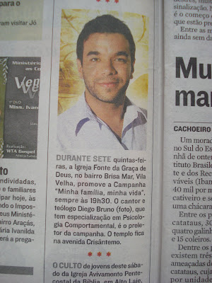 Conforme os dois maiores Jornais do Estado do ES publicaram, começa hoje, quinta-feira (14), a campanha de sete quinta-feiras com tema: "Minha família, minha vida", na Igreja Fonte da Graça de Deus, em Vila Velha/ES. A campanha trabalhará sete pilares da família por uma perspectiva da Teologia e da Psicologia Comportamental. Diego Bruno, o Preletor, é Teólogo, Especialista (pós-graduado) em Psicopedagogia, com especialização em: Psicologia Comportamental, Neurolinguística e Ensino Religioso. É também Autor, Cantor e Compositor. Aguardamos você e sua família.